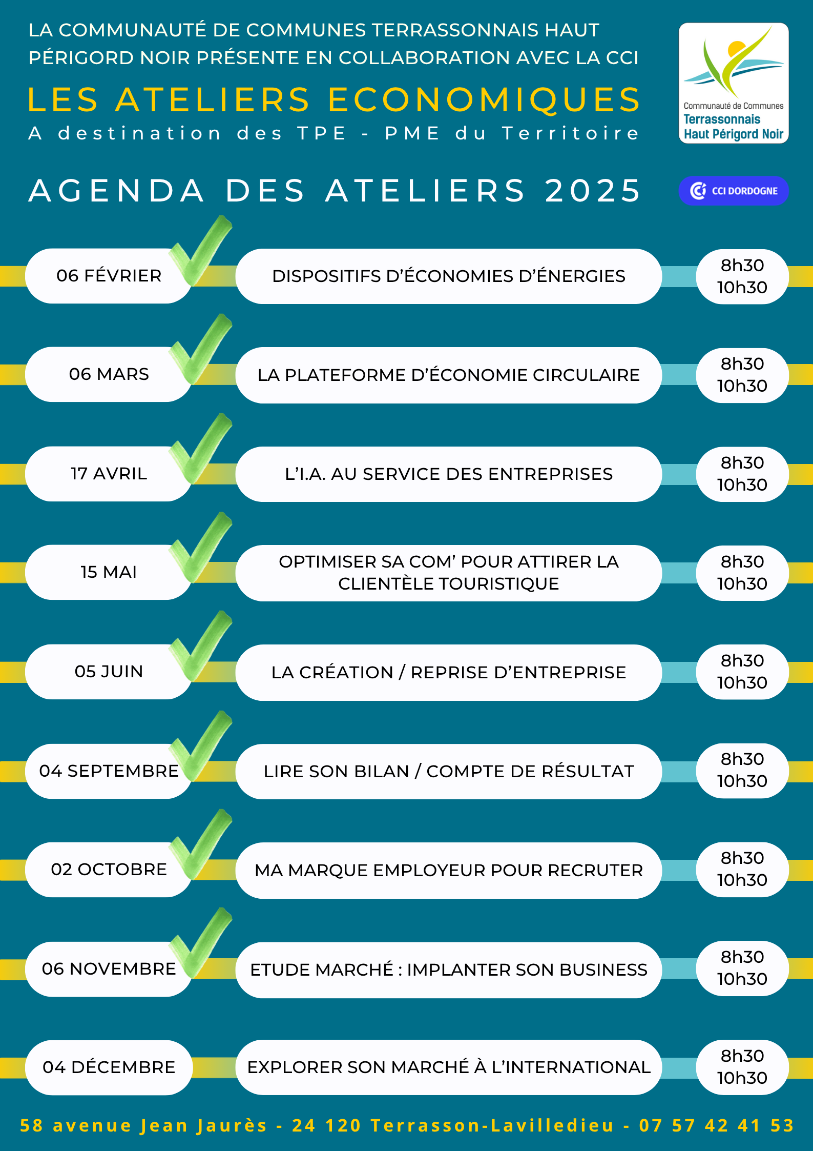 La Communauté de communes du Terrassonnais Haut Périgord Noir poursuit son accompagnement des entreprises et porteurs de projets du territoire à travers ses Ateliers Économiques, des temps d’échanges conviviaux et pratiques dédiés aux TPE, PME et futurs entrepreneurs.